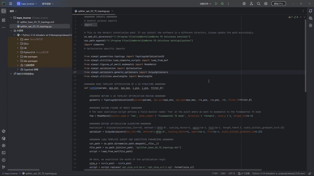 仿真是逆设计的核心组成部分。用户首先配置仿真环境,设定光学器件的工作频率、材料属性、几何约束等基本参数。