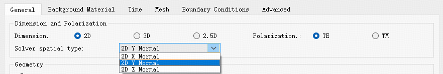 | 2D | 二维仿真模式。TE : TE 偏振,计算Ez、Ex、Hy三个场分量;TM : TM 偏振,计算Ey、Hz、Hx三个分量; Simulation Plane Spatial Type :可选择 Z、X 或 Y 轴作为平面的法线方向。 |