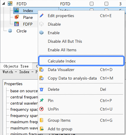 如需获取实际仿真求解器中使用的折射率分布,可右键点击 Calculate Index 按钮。该操作将调用求解器引擎进行网格划分,从而生成与仿真一致的折射率分布。在3D仿真中,对结构表面,求解器对共形网格(conformal mesh)采取了特殊处理,可能导致折射率分布与预览结果之间存在细微差异。此外,通过脚本命令 updateindexmonitor 也可实现相同功能,详细信息请参见updateindexmonitor。